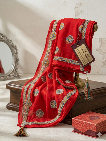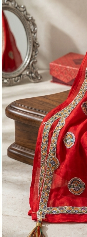 Immerse yourself in the timeless elegance and vibrant culture of Rajasthan with our Akash Red Meenawati Odhani. This exquisite piece is not just a veil; it is a wearable work of art, meticulously crafted by master artisans to capture the essence of traditional Indian bridal and festive wear.